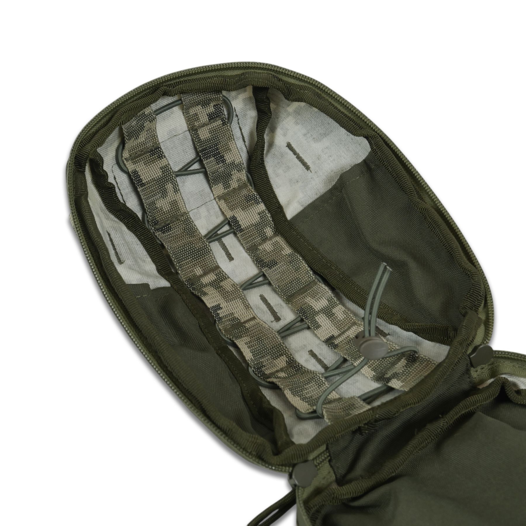 Внутрішній простір підсумка зроблений у вигляді органайзера, за рахунок строп Molle, переплетених резинок та двох кишень, завдяки чому медикаменти та комплектуючі аптечки можна зручно та надійно зафіксувати у підсумку.