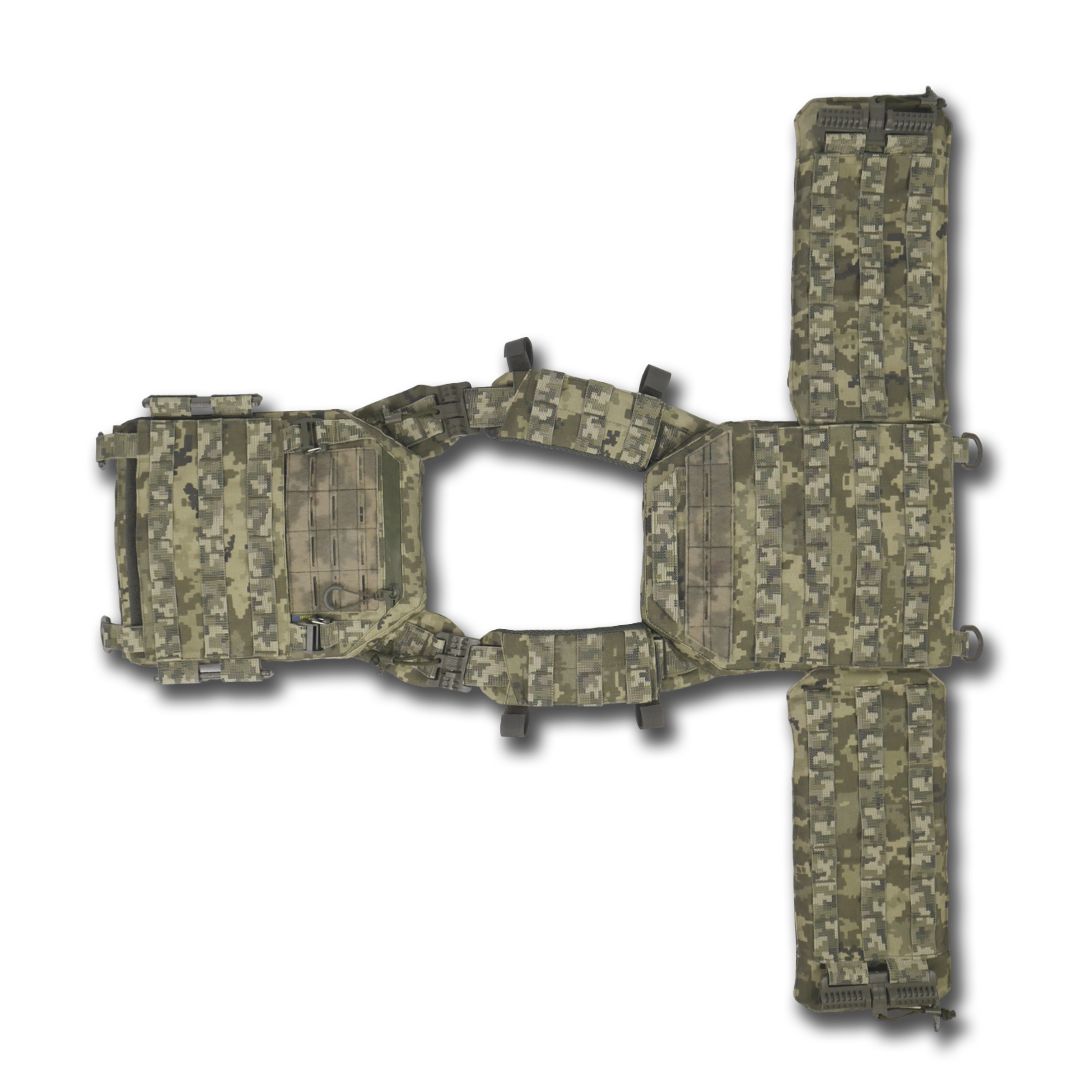 Камербанди мають 3 ряди строп Molle для кріплення підсумків і кишені під балістичні пакети 1-го або 2-го класу від компанії Militex, які можна придбати у нас разом із плитоноскою.