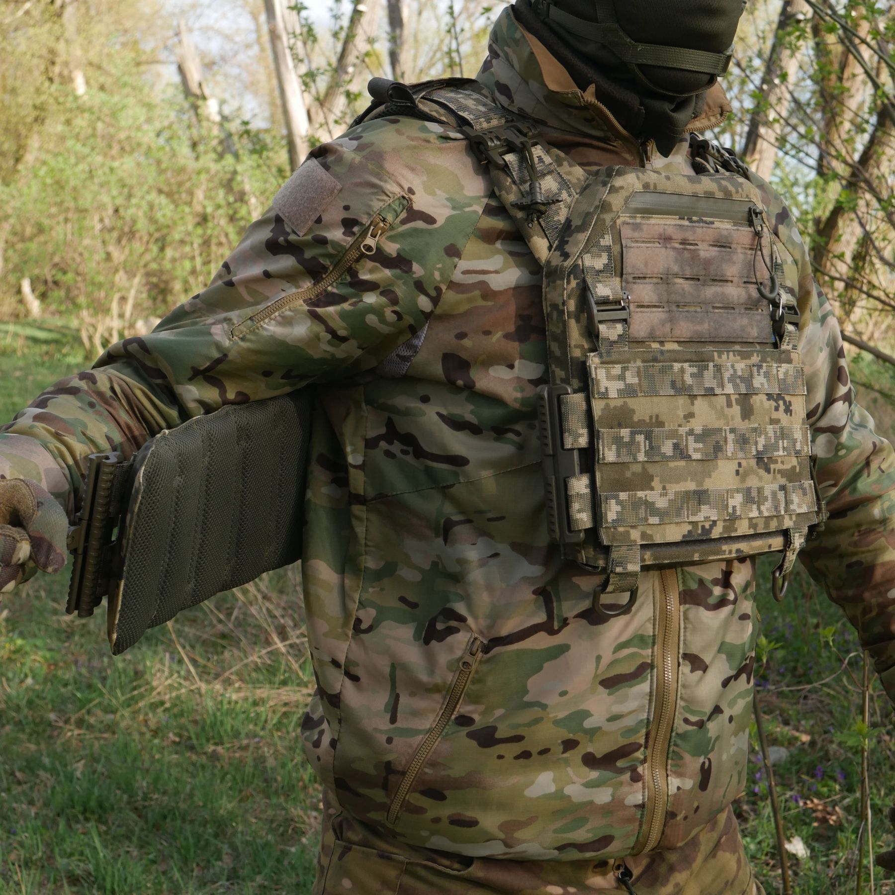 Плитоноска оснащена з’ємною передньою Molle панеллю яка кріпиться до основи на Velcro та додатково двома карабінами Woojin. На ній зручно розміщуються 3 підсумки під 1 або два магазини, або інше Molle-сумісне спорядження. Цю панель можна швидко замінити на іншу із закрікленим на неї заздалегідь набором потрібних підсумків.