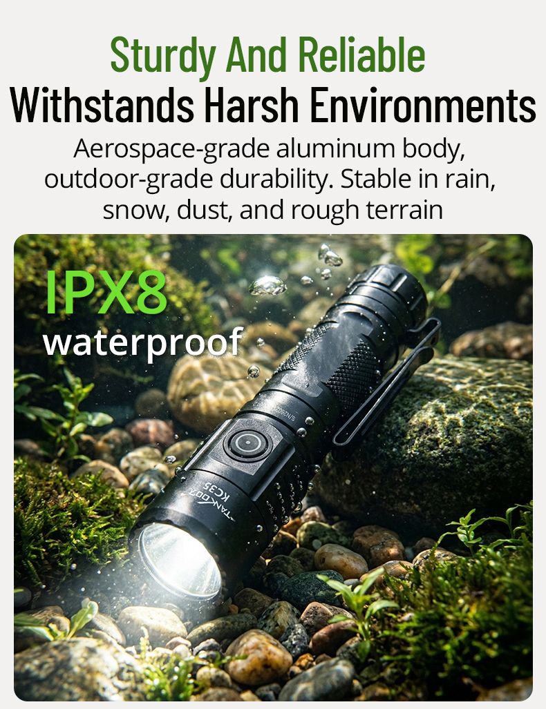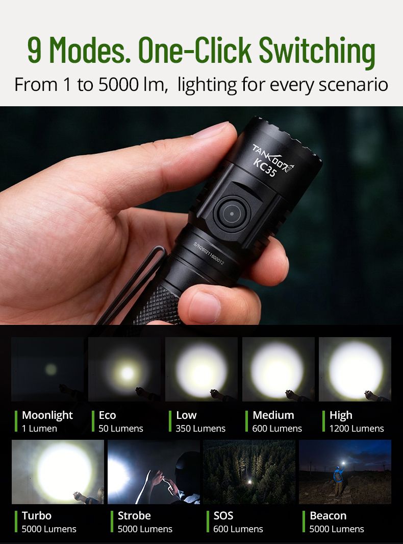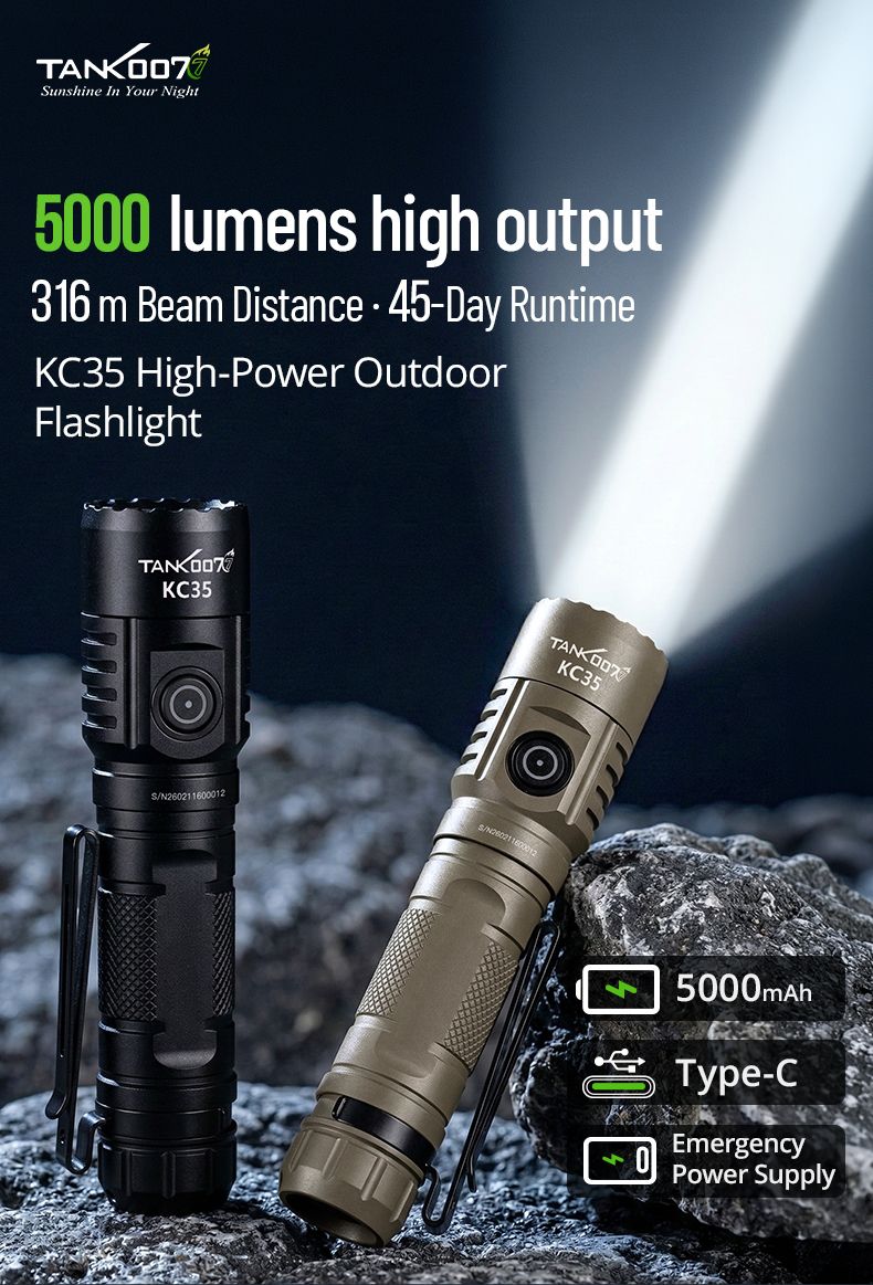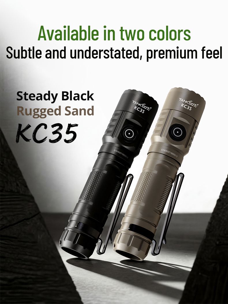 KC-35 - це потужний ліхтар, що може використовуватись як тактичний так і EDC. Він поєднує екстремальну яскравість у 5000 лм із компактними розмірами. Завдяки акумулятору 21700 він має чудову автономність, а стандарт IPX8 дозволяє використовувати його за будь-яких погодних умов. KC-35 може використовуватись як павербанк, що може допомогти в складних умовах.