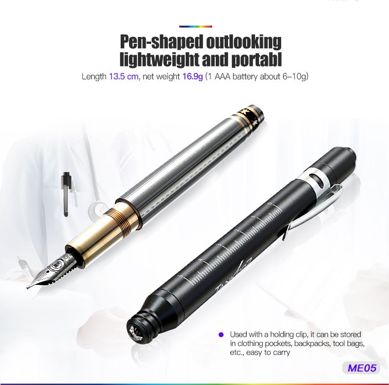ME05 - це вишуканий, компактний та портативний медичний ліхтар у формі ручки. Завдяки своїм габаритам та вазі він легко закріплюється за допомогою кліпси та завжди під рукою. Високоякісний світлодіод з індексом передачі кольору Ra ≥ 95 та драйвер із постійним струмом забезпечують стабільне світло без мерехтіння. Тепле світло безпечне для очей (без шкідливого синього спектра), нейтрально біле світло максимально наближене до природного денного. Ідеальний інструмент для ЛОР-лікарів, офтальмологів та проведення оглядів очей, вух, носа та ротової порожнини.
